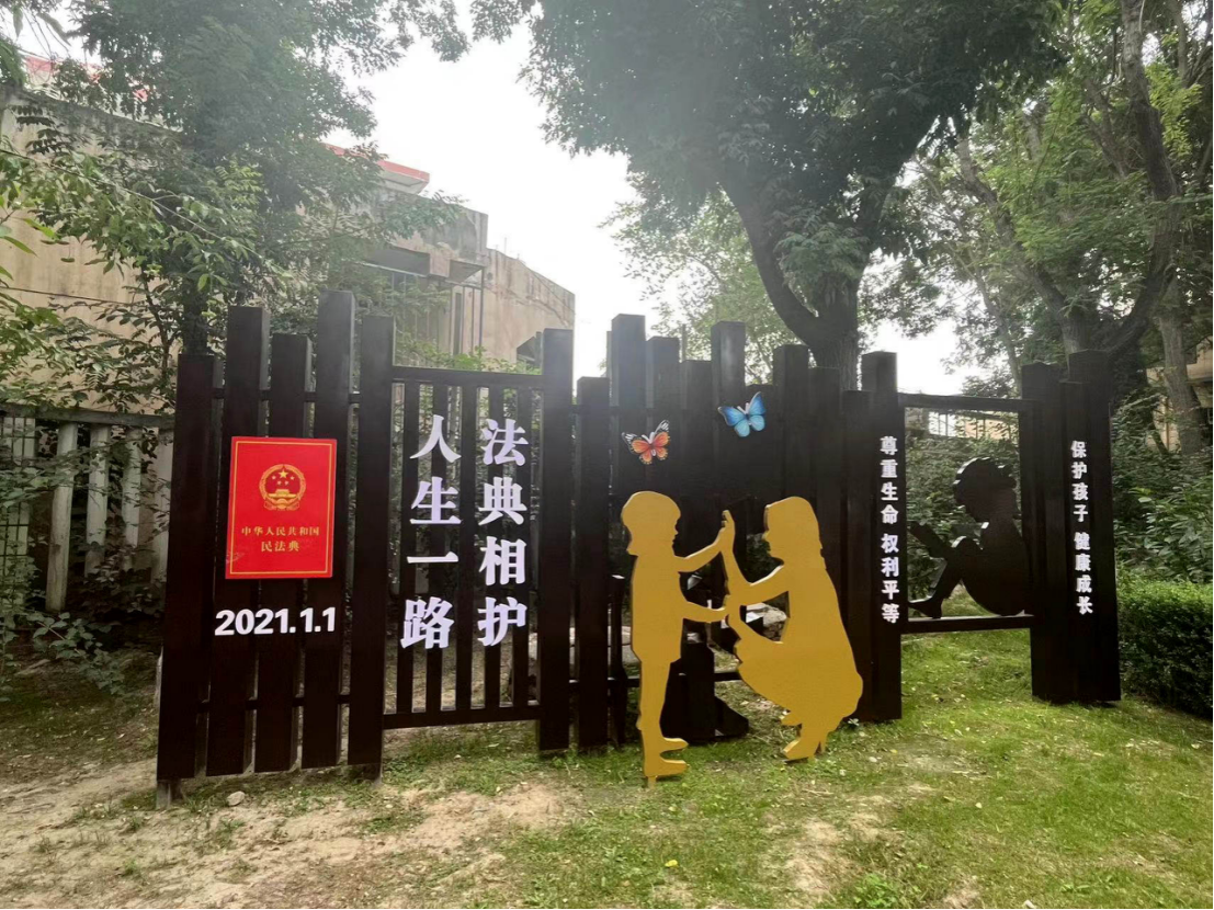 除了線上“第一課”,記者看到,金城公園設置憲心園、典護園、網絡安全主題區(qū)、法治文化廣場四大主題普法區(qū):憲心園設巨型《憲法》刻書;典護園設立了《民法典》宣傳建筑與母子雕塑;網絡安全主題區(qū)則以圓形建筑為“防護墻”,聚焦網絡詐騙、個人信息保護等,提升網絡安全意識;法治文化廣場融合明清仿古建筑與現代法律元素,設置《民法典》生活展牌、網絡普法園等。