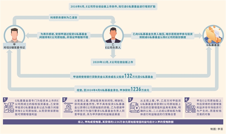 其中,2016年6月,E公司符合創(chuàng)業(yè)板上市條件,擬引進(jìn)G私募基金和H私募基金進(jìn)行增資擴(kuò)股。乙為感謝甲在企業(yè)用地審批等方面提供的幫助,提議安排甲通過投資G私募基金(該基金是專門為投資未上市的E公司而成立的股權(quán)投資基金,按照每股5.5元的價(jià)格取得E公司股本600萬股,并辦理相應(yīng)的變更登記手續(xù))間接持有E公司原始股,并告知甲E公司擬上市情況以及其會與G私募基金簽訂對賭協(xié)議(若E公司未實(shí)現(xiàn)上市,G私募基金有權(quán)要求乙原價(jià)回購,并按照年利率10%支付補(bǔ)償款),甲無需承擔(dān)市場風(fēng)險(xiǎn),穩(wěn)賺不賠,甲表示同意。此后,乙向G私募基金負(fù)責(zé)人施壓,暗示若拒絕甲參與投資將削減G私募基金認(rèn)購E公司的股份額度,并將該額度交由其競爭對手H私募基金認(rèn)購。隨后,甲違規(guī)使用銀行貸款資金以其親戚名義投資132萬元至G私募基金(根據(jù)相關(guān)規(guī)定,私募基金投資者應(yīng)當(dāng)具備相應(yīng)資金實(shí)力,不得用貸款資金從事股本權(quán)益性投資,甲的行為不符合規(guī)定)。2019年6月,I私募基金以每股11.52元溢價(jià)收購G私募基金持有的部分E公司股份。2020年12月,E公司在創(chuàng)業(yè)板上市。經(jīng)查,至2024年4月G私募基金清倉,甲凈獲利1236萬余元。