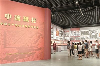 走進中國共產黨歷史展覽館四層專題展廳,首先看到一面紅底金字的大型展板,形似一本翻開的書本。“書”的正面,“中流砥柱”四個大字在燈光照射下閃閃發(fā)亮,下方緊跟一行小字“中國共產黨抗日戰(zhàn)爭檔案展”;側面,金色字體展示著毛澤東同志《中國共產黨在民族戰(zhàn)爭中的地位》里的內容:“每一個共產黨員必須發(fā)揮其全部的積極性,英勇堅決地走上民族解放戰(zhàn)爭的戰(zhàn)場,拿槍口瞄準日本侵略者。”