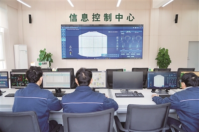 圖①:在中儲(chǔ)糧四川新津直屬庫信息控制中心,倉儲(chǔ)保管員通過在線監(jiān)控系統(tǒng)查看倉儲(chǔ)作業(yè)情況。