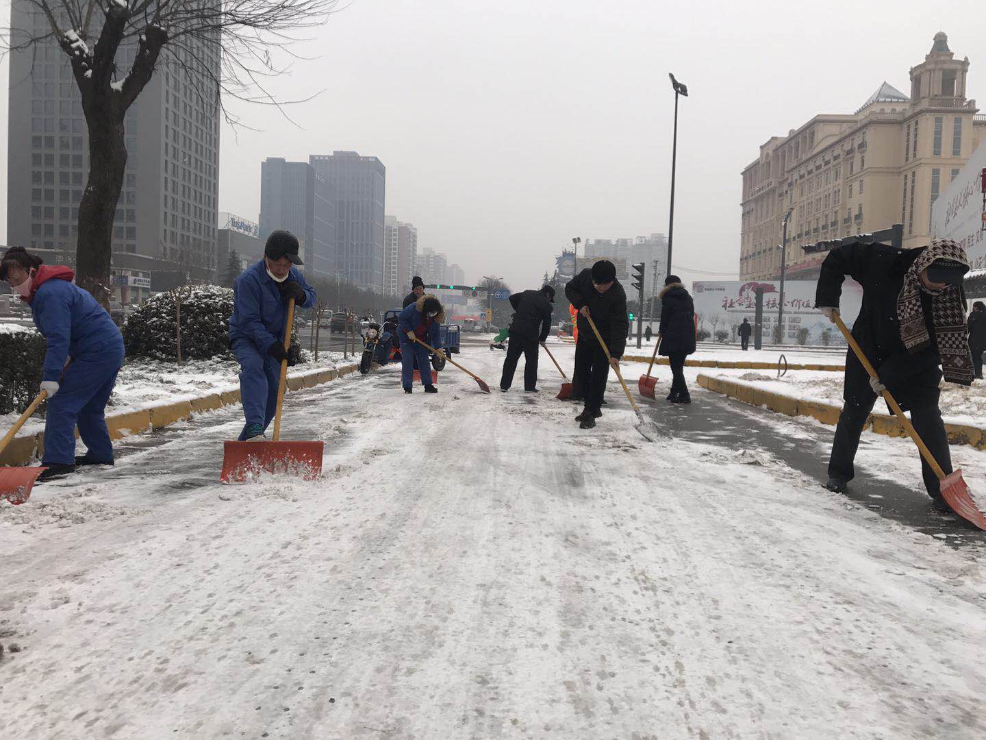 由于氣溫較低,主干道路的雪被壓得很瓷實,清掃工作十分困難。天氣雖然寒冷,但是大家熱情高漲,即使手凍的通紅,也擋不住大家的干勁。都爭先恐后,團結(jié)協(xié)作、井然有序,掃的掃、鏟的鏟,干勁十足,一心想著將路面的積雪盡快清除,經(jīng)過一天的奮戰(zhàn),基本將包抓路段、主干道積雪清掃干凈,確保了廣大居民、業(yè)主的出行安全。