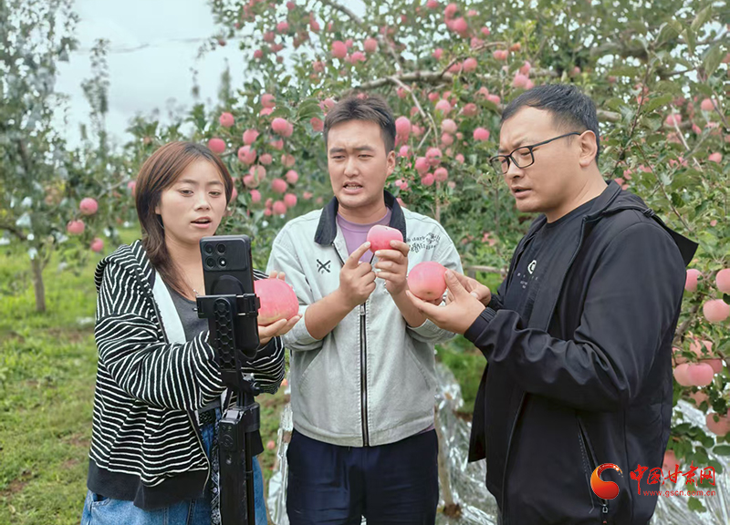 果園里,團(tuán)隊(duì)又開(kāi)始了新一輪直播,年輕主播手捧一顆嘎啦蘋(píng)果仔細(xì)講解,后臺(tái)訂單提示音此起彼伏。