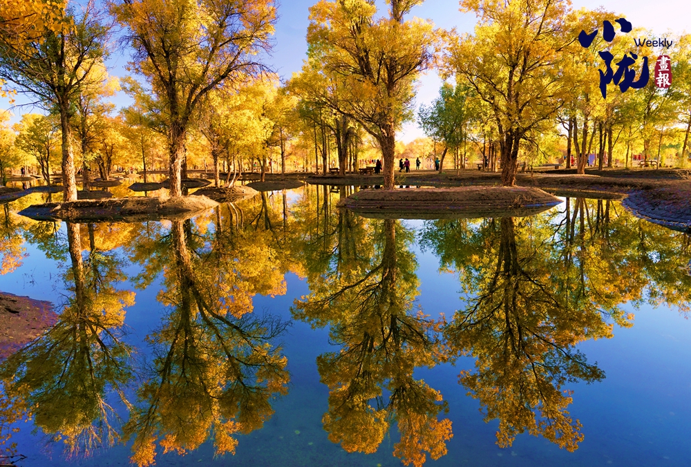 胡楊茂盛,疊翠流金,裊裊身姿倒影湖中。風一吹,樹梢輕顫,成千上萬片葉子像被點燃的火焰,在藍得沒有一絲雜質(zhì)的天空下翻涌、跳躍,充滿詩意。林間小道上,游客悠閑漫步,盡享美好時光。