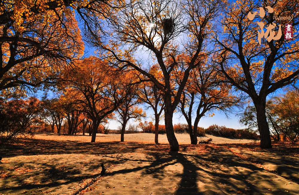 金塔胡楊林生長的多是水中胡楊,有著與額濟納旗胡楊林完全不同的風格。一汪汪大大小小的水潭穿插在成片茂密的胡楊林間,婀娜的金色胡楊挺立在水平如鏡的湖中,藍天、碧水、黃葉……構成了一幅色彩斑斕的油畫!