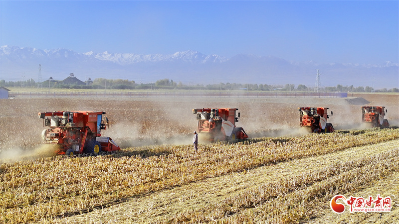 時(shí)下,在甘肅省張掖市民樂工業(yè)園區(qū)濱河集團(tuán)萬畝原糧種植基地,農(nóng)機(jī)手駕駛收割機(jī)穿梭田間地頭收割高粱,一派繁忙豐收景象。
