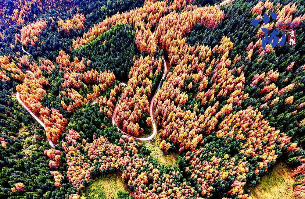 從空中俯瞰,彩林點(diǎn)綴,層層疊疊、錯(cuò)落有致,在這片彩色畫卷中,一條小路蜿蜒伸展,似銀蛇游走,為這靜謐的畫面增添了靈動(dòng)的韻律。