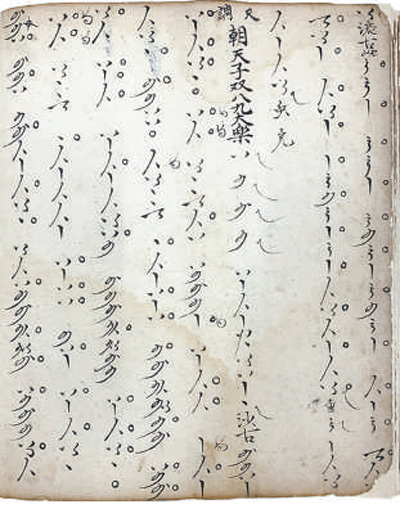 二是音位型曲譜,以各類符號(hào)指代樂(lè)器上的音位。使用這類曲譜,必須首先明確弦樂(lè)器的定弦、定品方式,管樂(lè)器的開孔標(biāo)準(zhǔn)和按孔、吹奏方法,才能確定每個(gè)音位的實(shí)際音高。正因如此,音位譜往往與樂(lè)曲宮調(diào)密切相關(guān)。同一份譜子,換用不同宮調(diào)演奏,音響大不相同。20世紀(jì)初,敦煌藏經(jīng)洞曾發(fā)現(xiàn)一份五代時(shí)期的曲譜,采用20個(gè)琵琶音位符號(hào)記錄,是目前已知這類曲譜的早期代表。