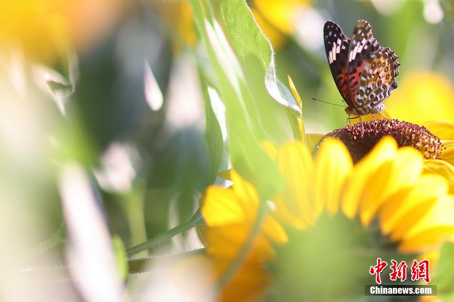 資料圖:圖為蝴蝶在向日葵上棲息。 泱波 攝