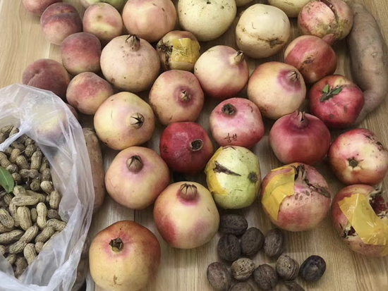 2019年10月10日收到一箱果品,一張字條寫(xiě)著:“甜石榴21個(gè),酸石榴5個(gè)(石榴皮上有膠帶和‘酸’字),甜梨5個(gè),美人紅桃子,地瓜2塊,花生,核桃(不好看,請(qǐng)品嘗)。”