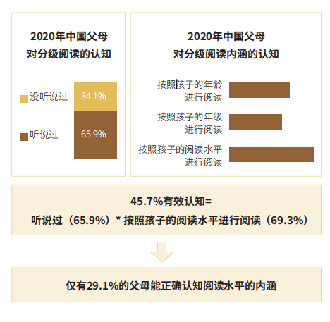 雖然分級(jí)閱讀已經(jīng)成為國(guó)際公認(rèn)的閱讀趨勢(shì),可是,從當(dāng)當(dāng)聯(lián)合艾瑞發(fā)布的《2020年中國(guó)K12階段學(xué)生“分級(jí)閱讀”白皮書》(以下簡(jiǎn)稱《白皮書》)中,我們發(fā)現(xiàn)中國(guó)大部分父母對(duì)于分級(jí)閱讀尚缺乏認(rèn)識(shí),更談不上有足夠的重視?!栋灼分赋?,有65.9%的父母聽說過“分級(jí)閱讀”,而其中真正了解“分級(jí)閱讀”的父母只占45.7%。