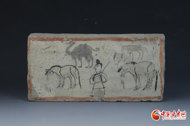 另一方面,它采用沒骨畫法,以彩色為墨,通過墨色濃淡來表現(xiàn)空間的遠(yuǎn)近。遠(yuǎn)處駱駝、毛驢的形象在墨色變化中層次分明,形成強(qiáng)烈的對(duì)比感。“此磚不僅是中國已知現(xiàn)存較早運(yùn)用沒骨畫法的美術(shù)作品之一,而且這兩種繪畫手法并用在一塊壁畫磚上的情況,在中國美術(shù)史上也是較早的發(fā)現(xiàn),甚至比西方出現(xiàn)類似手法還要早。”孫麗娟介紹。