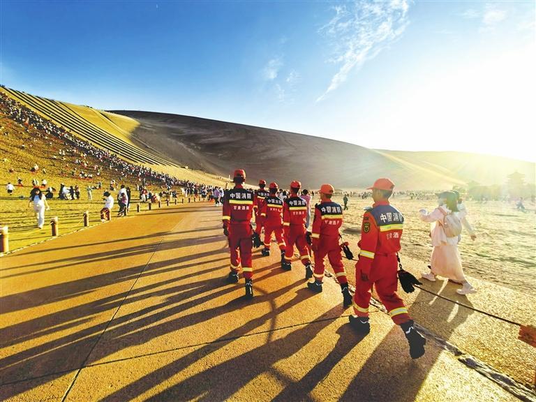 溫情關(guān)愛救助游客。鳴沙山“萬人大合唱”作為敦煌近年來的熱門文旅項(xiàng)目,暑期每日吸引數(shù)萬游客前來打卡,人群密集,安全隱患不容忽視。根據(jù)敦煌市委、市政府的安排,大隊(duì)每天派出消防車輛和指戰(zhàn)員現(xiàn)場執(zhí)勤,并根據(jù)實(shí)際需要在月牙泉和鳴沙山設(shè)置了兩處群眾服務(wù)救助執(zhí)勤點(diǎn),由20人組成“九色鹿”女子消防服務(wù)隊(duì),提供傷病緊急救助、失物尋找、人員疏散引導(dǎo)、安全知識宣傳教育等服務(wù)。僅今年,就幫助找回走失兒童21名、手機(jī)和錢包60余件,救助中暑等突發(fā)疾病游客7人。“九色鹿”女子消防服務(wù)隊(duì)的隊(duì)員們既懂外語,又了解敦煌文化,還熟悉消防安全知識,掌握一定的醫(yī)療救助和應(yīng)急救援技能,她們的貼心服務(wù)受到了游客的好評,成為敦煌一道亮麗的風(fēng)景線。