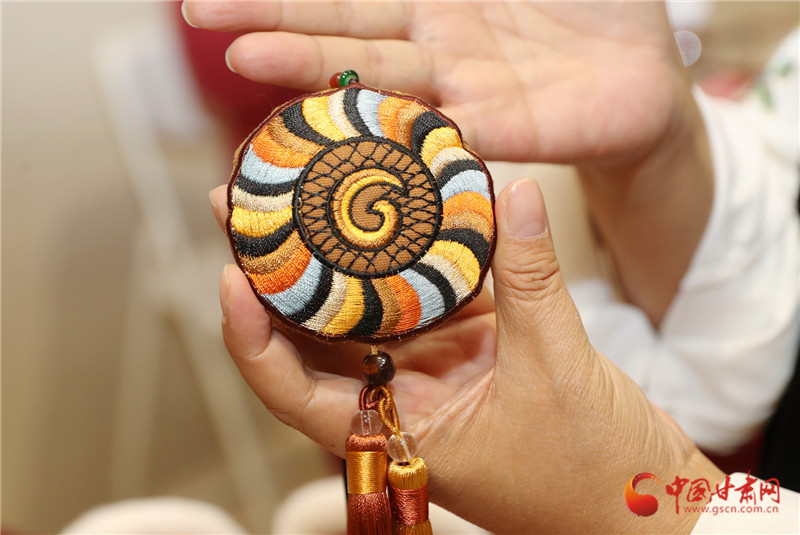 真正讓她想“給香包加點新東西”,是一次省博看展的觸動。站在馬家窯彩陶罐前,她盯著罐身流轉(zhuǎn)的旋渦紋出了神:“這么好看的紋路,繡在香包上多妙?”后來去敦煌,莫高窟里飛天的飄帶、藻井的繁復(fù)花紋更讓她挪不開腳?;貋淼穆飞希粋€念頭愈發(fā)清晰:要讓博物館里的文物“活”在香包里,讓老手藝沾染上“文化氣”。