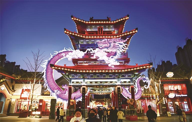 沿著青石板路前行,高達數(shù)米的“祥龍瑞躍”主燈組璀璨奪目;緊隨其后的“天驥呈祥”“花簇錦年”“福運財神”等主題燈組依次鋪陳,仿佛將吉祥與喜慶灑滿街巷。老街外圍的現(xiàn)代燈陣不停變換,張掖丹霞的瑰麗、黃河波濤的壯闊,在光影中流轉(zhuǎn)成甘肅的壯美詩篇。