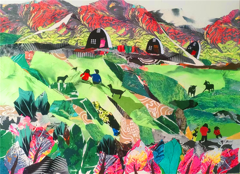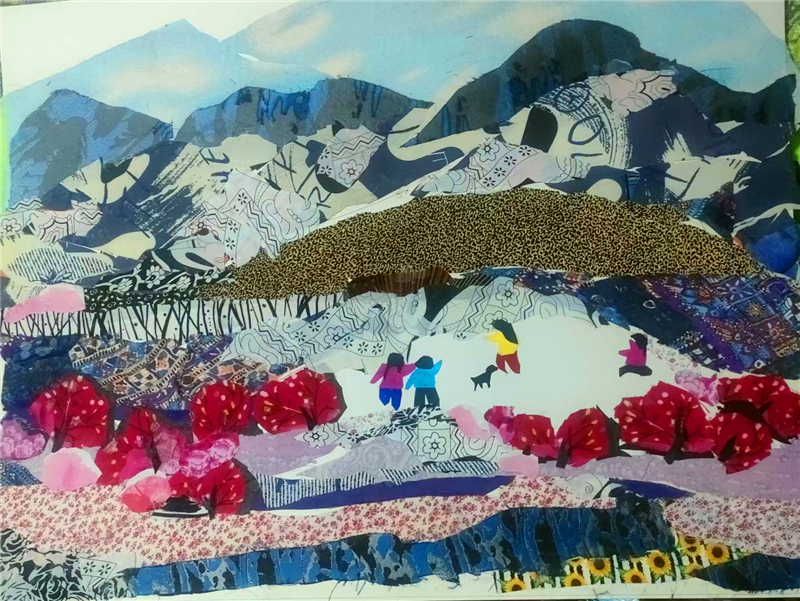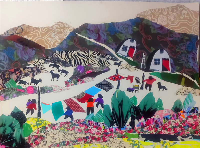 裁剪環(huán)節(jié)更見功力。她以“銳利”之心駕馭剪刀,根據(jù)畫面需求將碎布剪成不同形狀,有的需棱角分明,有的要圓潤柔和。粘貼時,她摒棄簡單的粘合方式,采用傳統(tǒng)縫補與現(xiàn)代鑲嵌相結(jié)合的技法,讓布料與底板緊密貼合,既保證了作品的耐久性,又營造出自然的浮雕感。在《黃土風情》布貼畫中,她用層層疊疊的碎布表現(xiàn)黃土高原的溝壑縱橫,用深淺不一的色塊勾勒窯洞的錯落有致,指尖翻飛間,碎布頭便有了筋骨與神韻。